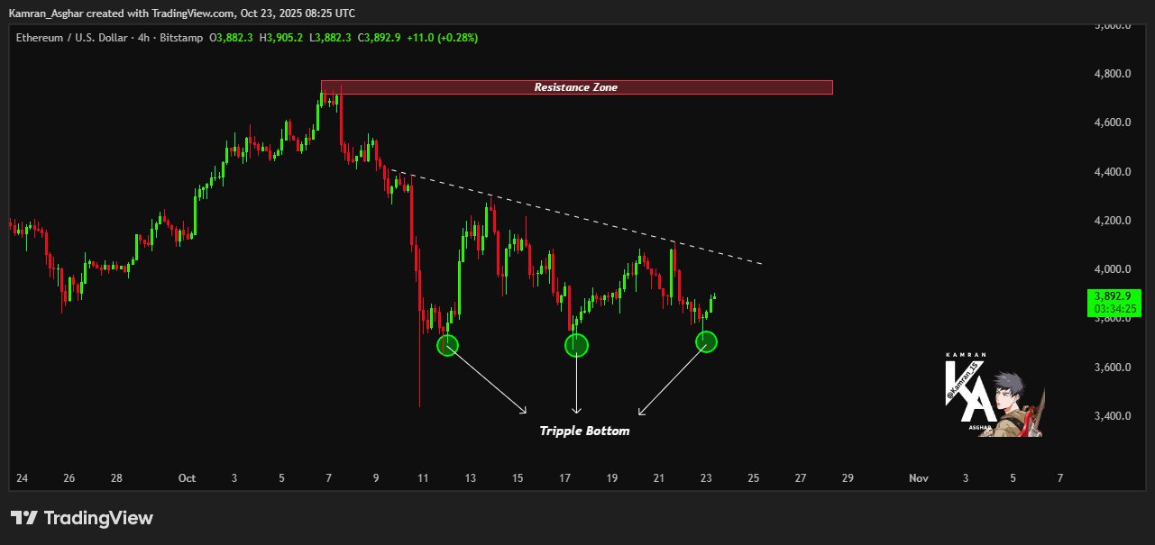 以太坊在3750–3800美元附近的三重底形态暗示10月份可能出现10%的回暖。