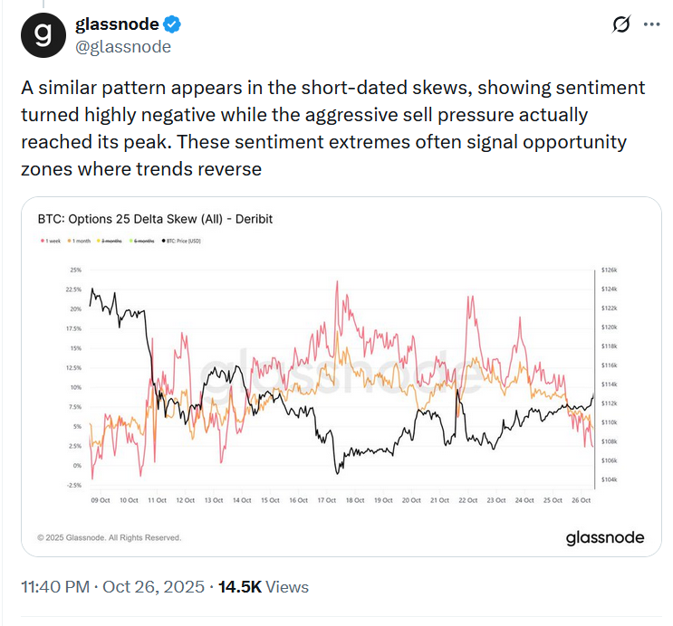 在周日的X帖子中,Glassnode暗示趋势逆转正在酝酿,因为抛售压力和负面情绪似乎已经达到极端峰值。