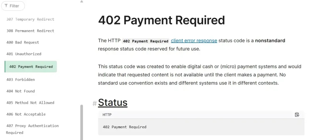 于是,一些开发者重新翻开了 HTTP 协议的文档,注意到了那个沉睡三十年的状态码,402 Payment Required。