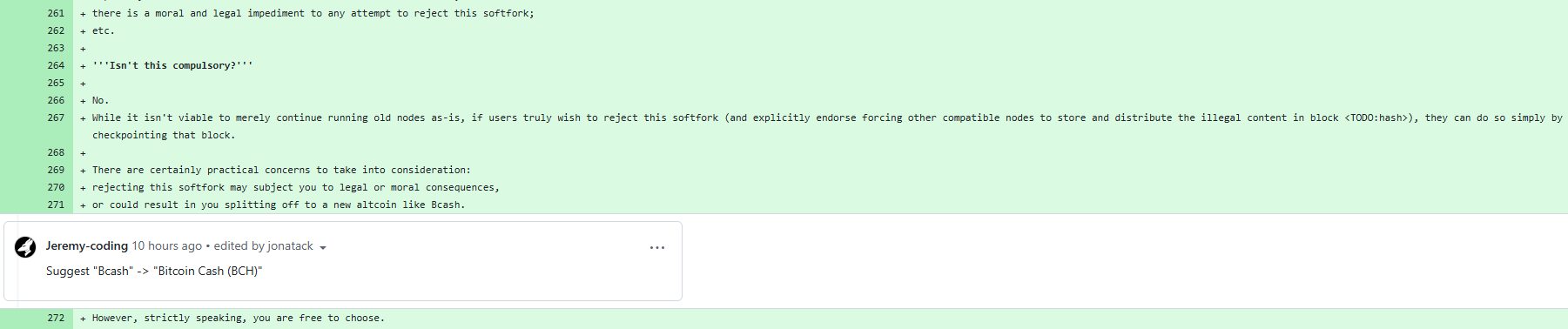 然而,在这份改进提案中,开发者在第261行写道:“任何试图拒绝此次软分叉都存在道德和法律障碍。”