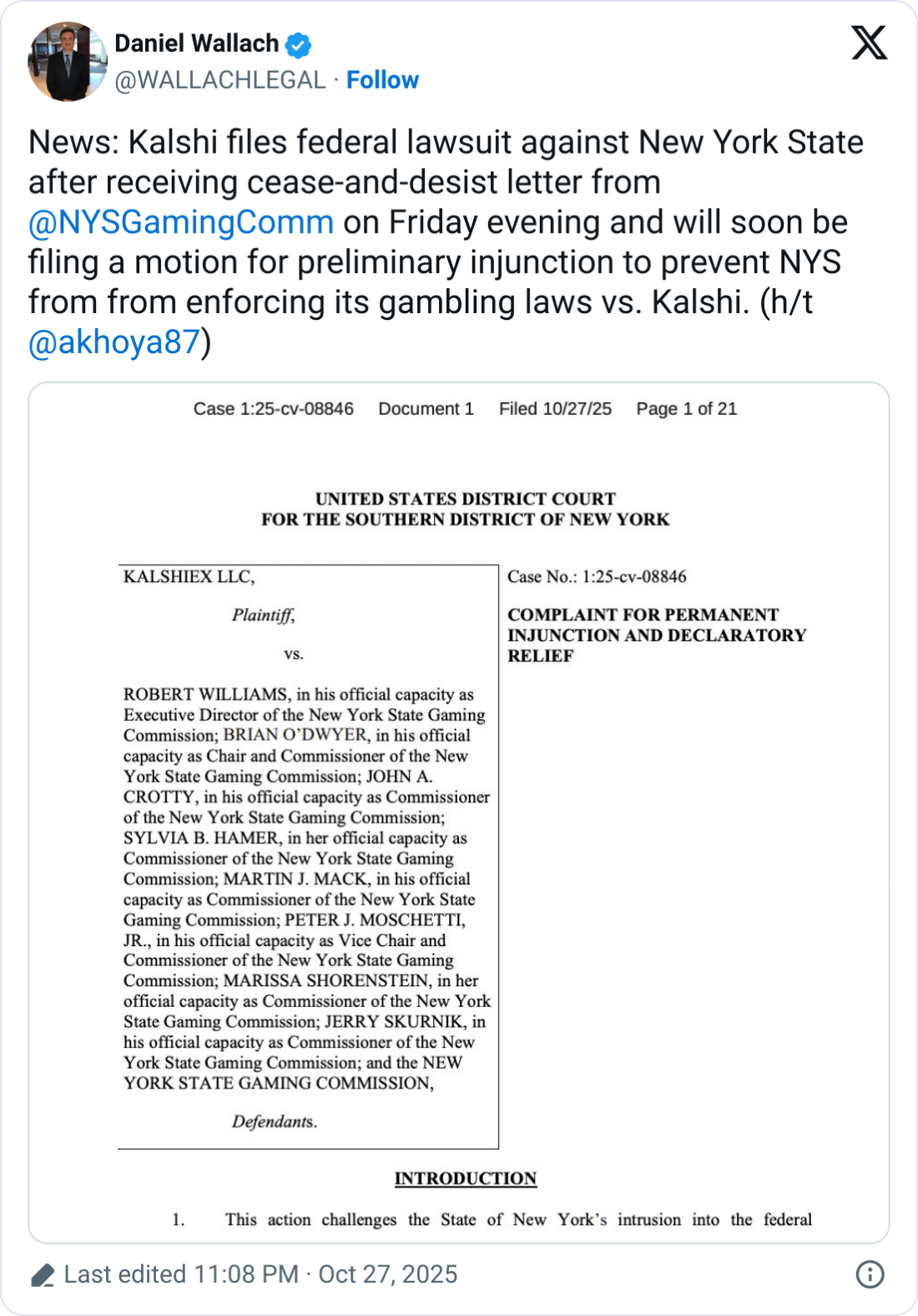该公司声称自己"受CFTC专属管辖",纽约"监管Kalshi的努力既被领域抢占也被冲突抢占"。