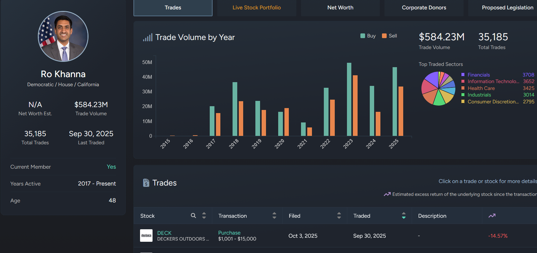 根据Quiver Quant的数据,Khanna本人在2025年的股票交易量已达8030万美元。