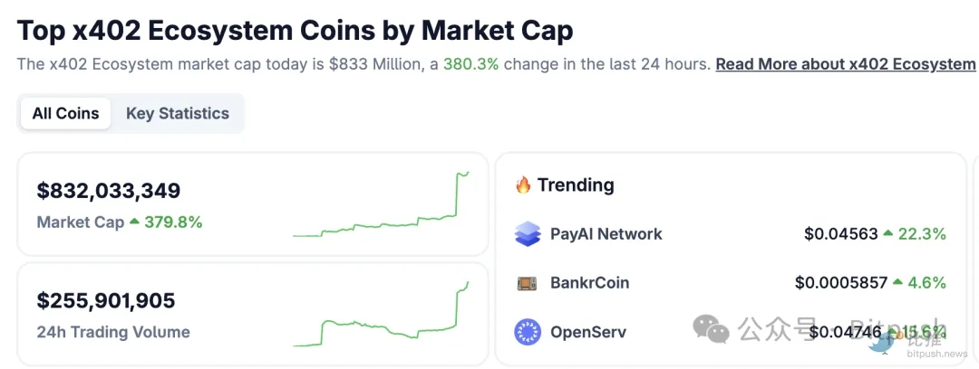 而整个 x402生态的总市值也在CoinGecko上突破了8亿美元。