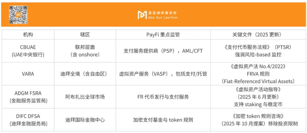UAE的PayFi业务监管呈 “分而治之” 格局,四大支柱各司其职: