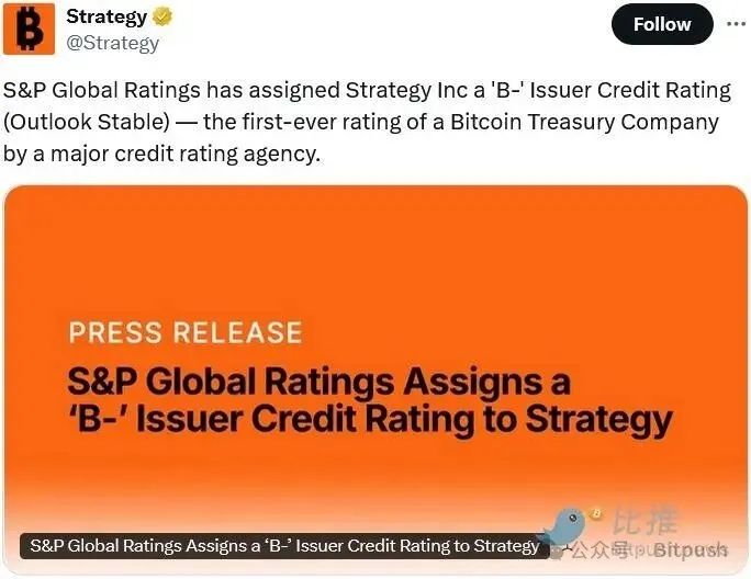 因此,标普此次给予 Strategy 的 B- 评级,其本身并非关键。真正具有象征意义的信号在于:以比特币财库为代表的新模型,已经发展到传统评级体系无法再忽视,并不得不尝试去“解释”的地步。