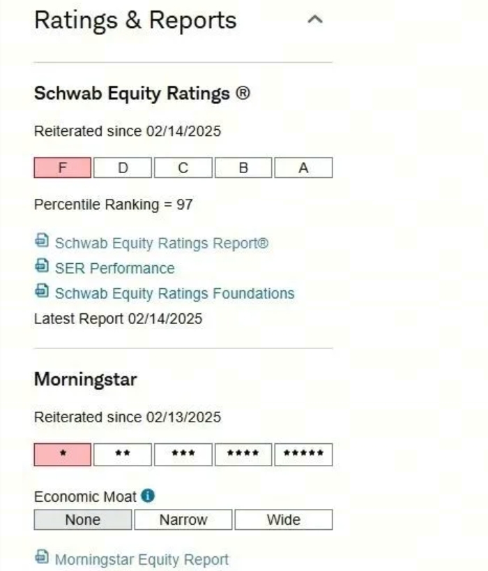 例如 Charles Schwab的 Schwab Equity Ratings 系统(A 到 F 评级,F 为最低表现预期),过去 3-5 年内几乎长期将 Coinbase (COIN) 和 MicroStrategy (MSTR) 评为 F。