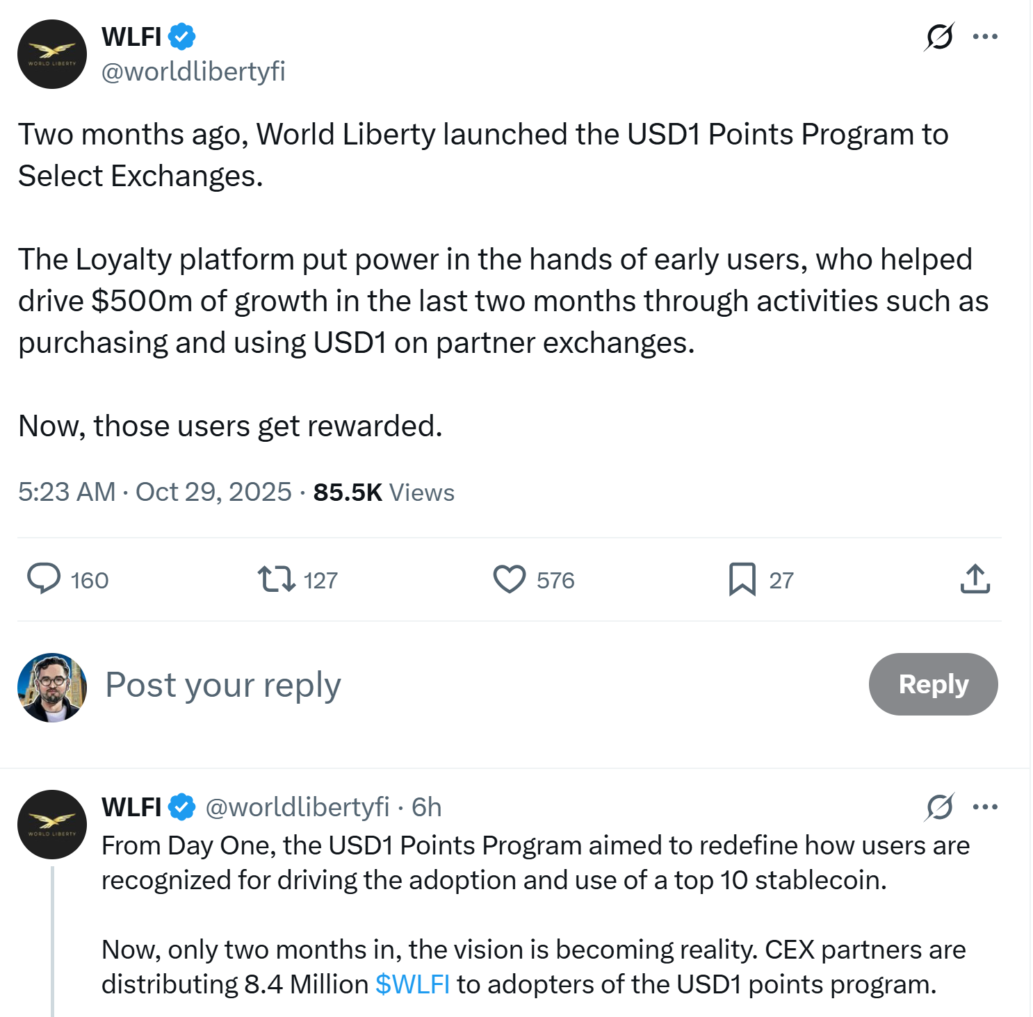 此次空投将奖励加入USD1积分计划的用户,该计划于两个月前启动,旨在促进World Liberty美元支持稳定币的采用。参与者通过在合作交易所交易USD1交易对和维持余额来获得积分。