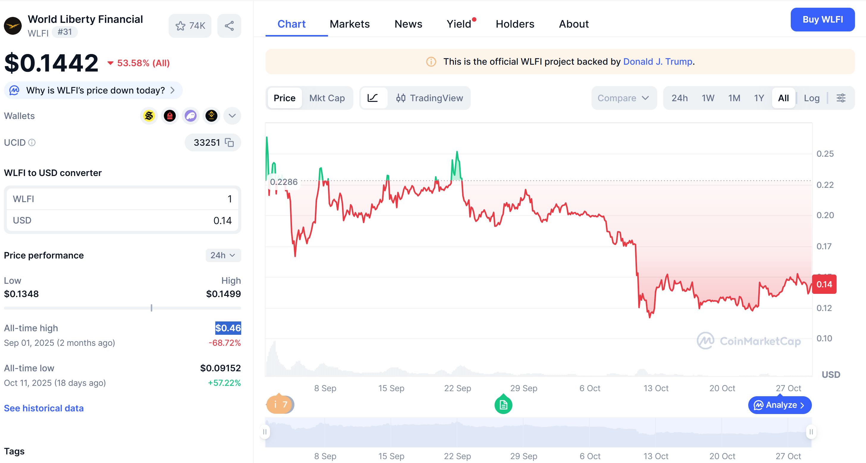 CoinMarketCap数据显示,WLFI目前交易价格为0.14美元,过去24小时下跌0.5%。该代币较9月创下的历史高点0.46美元下跌近70%。