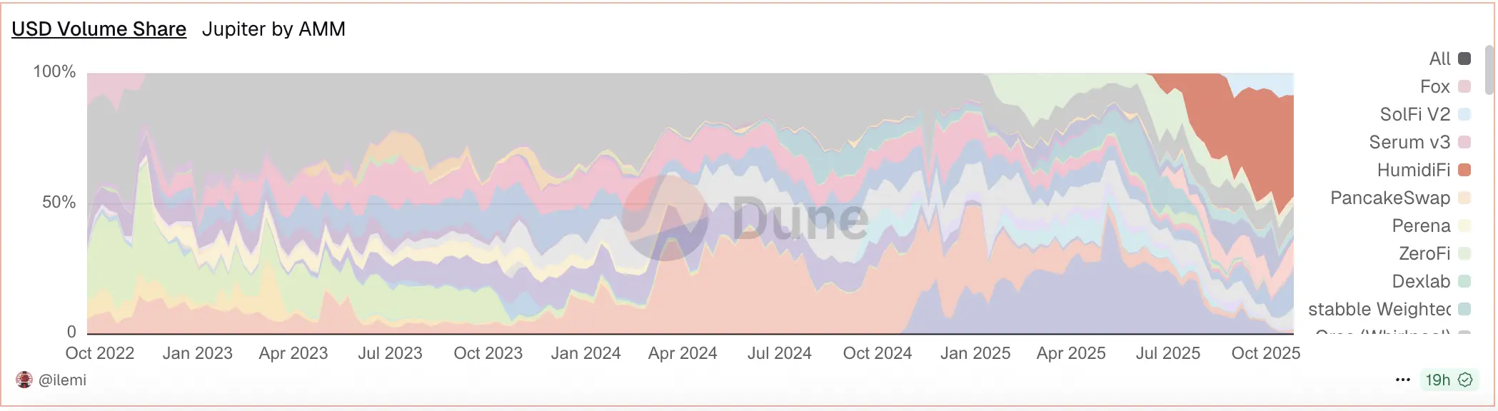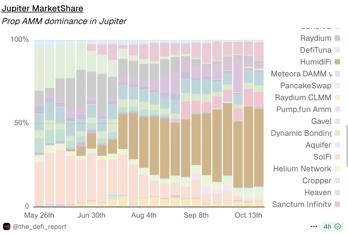 HumidiFi 在 Jupiter 路由中的渗透率也极高。作为 Solana 上占据 86.4% 市场份额的聚合器,Jupiter 的路由选择很大程度上决定了交易者的实际体验。10 月 20 日的数据显示,HumidiFi 在 Jupiter 中的市场份额高达 46.8%,是第二名 TesseraV(10.7%)的四倍多。
