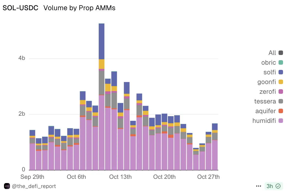 HumidiFi 的统治地位在 SOL/USDC 交易对中表现得尤为明显。在 10 月 28 日这一天,HumidiFi 单日处理了 10.8 亿美元的 SOL/USDC 交易,占当日该交易对总量的 64.3%。