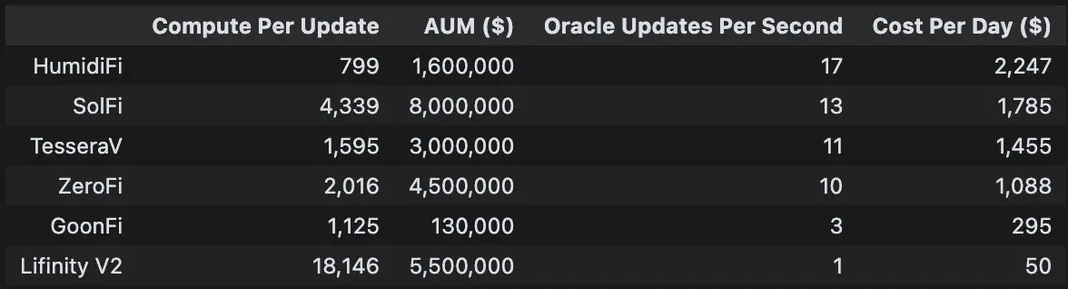除此之外,HumidiFi 在成本控制方面也做的很好。HumidiFi 每天的运营成本仅为 2,247 美元。相比之下,SolFi 虽然管理的资金规模(AUM)是 HumidiFi 的 5 倍(80 亿美元 vs 16 亿美元),但每日成本仅比 HumidiFi 低 20%(1,785 美元)。