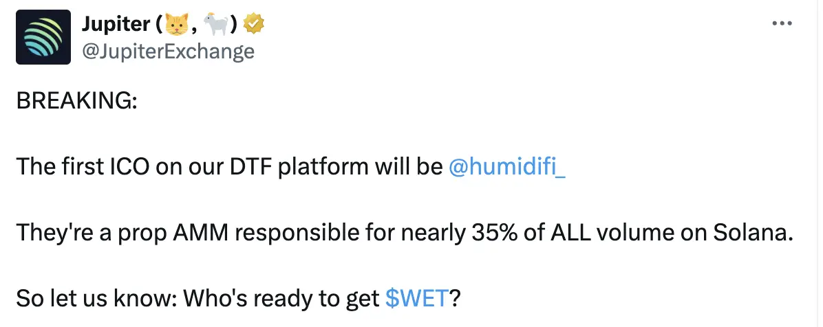 在 10 月 30 日晚间的 community call 中,Jupiter 团队宣布了他们的 ICO 平台 DTF 的首期发射项目:HumidiFi,代币标识为 WET