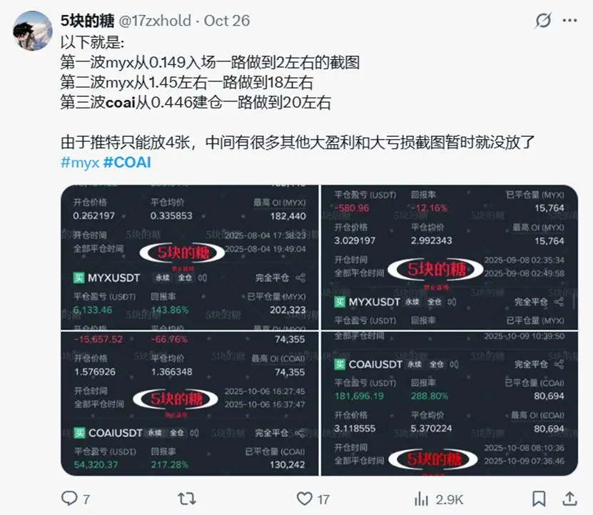 此外,KOL sanyi.eth 则反思,做空 MYX 亏损后已经主动避开妖币,COAI 从0.3美元涨至61美元再回撤至18美元,该项目虽此前获得约1700万美元融资并获 Binance Labs支持,定位于 AI 赛道,项目基础不算薄弱。然而币价与估值相比,市场情绪明显过热,散户参与此类波动剧烈的币种,结局多为爆仓或支付高额资费。