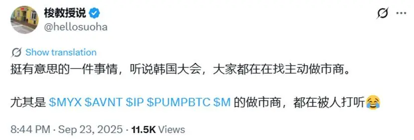 值得一提的是,据X用户 @hellosuoha反映,上个月在韩国首尔举办的KBW 2025大会上,MYX、AVNT、IP 等项目的成交深度引发关注,它们背后的做市商已然成为潜在拟发币项目方的重点联系对象。