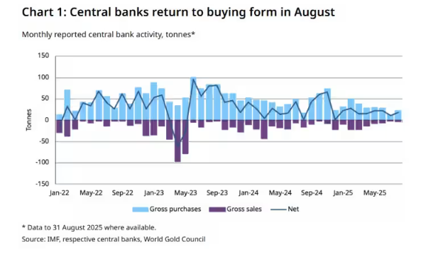 根据世界黄金协会10月3日发布的数据,8月各国央行共增加了19吨黄金储备,此前7月曾出现月度下降。