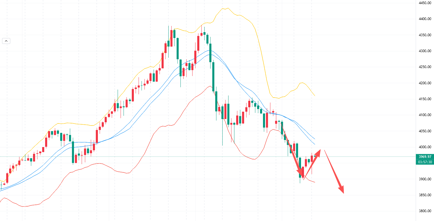 周一黄金跌破4000美元整数关口,昨日白盘延续震荡下行,欧盘回落到3886后企稳反弹,再度失守3900。昨日分析的行情走弱会在4020直接下来,3950跌破回来到3900,基本上是比较符合预期的。4000整数关口多次提供有效支撑,一旦破位就会转化为强阻力,对后续金价反弹形成*。