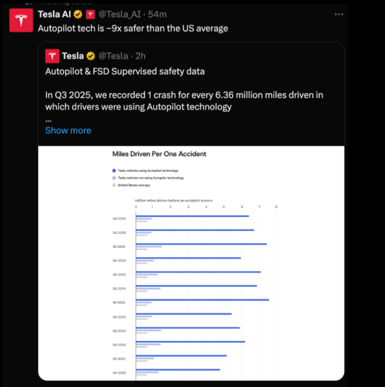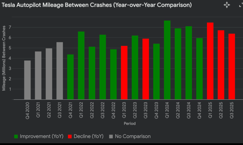 2025年第一季度,启用Autopilot后的平均事故间距为约1159万公里,低于2024年同期的约1207万公里;