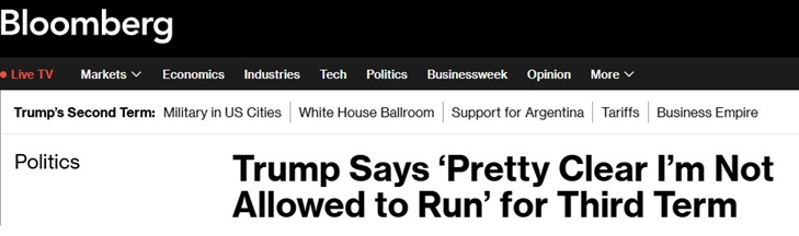 FX168财经报社(亚太)讯 美国彭博社周三(10月29日)报道称,美国总统特朗普(Donald Trump)周三承认,尽管近几个月来他频繁提及竞选连任第三届总统的想法,但宪法“非常明确”地禁止他这样做。