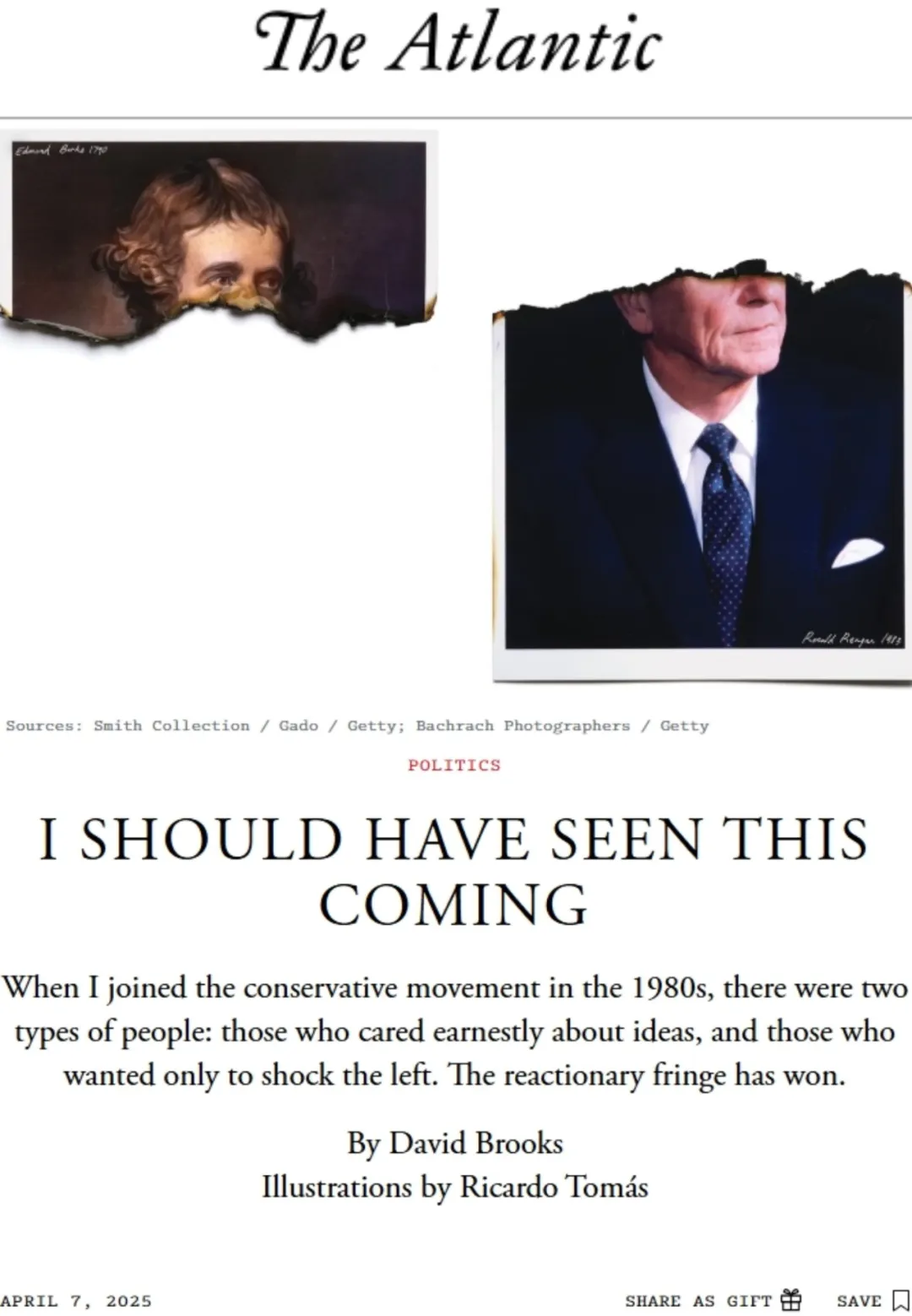 《信息正义》曾经译介过大卫·布鲁克斯在《大西洋月刊》发表的“忏悔录”:《我早该料到》(I should have seen this coming),他在文中痛陈极端保守派对美国的戕害,指出川普主义终将崩溃的终局,但因故未能在微信公众号上发出。