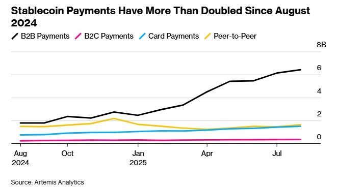 根据区块链数据提供商Artemis的报告,8月份通过稳定币进行的商品、服务和转账交易额超过100亿美元,相比2月份的60亿美元增长约70%,并且较2024年8月的交易量翻了一倍多。