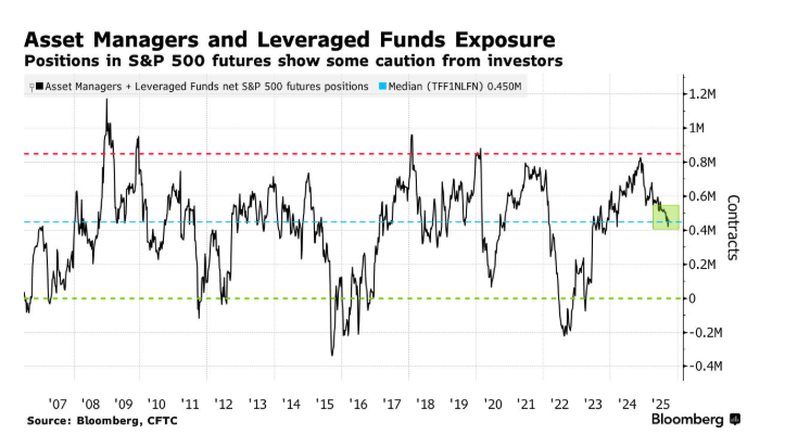 此外,他们指出,美国股指期货的投机头寸目前已接近长期中值,而在2024年和2025年第一季度曾远高于中值。这意味着整体敞口处于历史平均水平附近,并未过度暴露在风险下。
