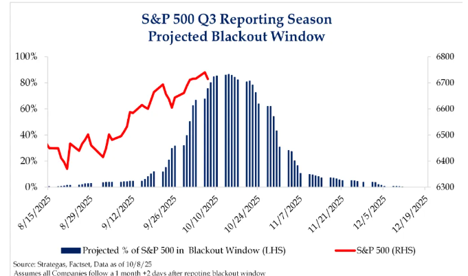 随着财报季即将开始,Strategas的瑞安·格拉宾斯基指出,未来两周将进入“回购静默期高峰窗口”。
