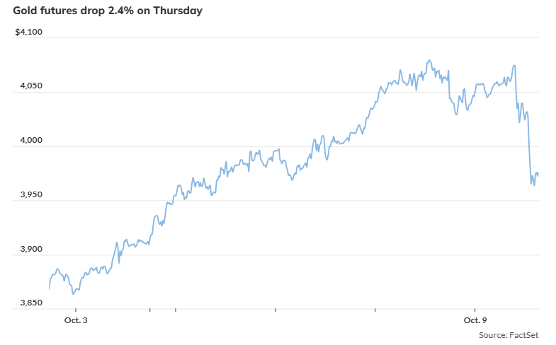 黄金的强劲上涨行情暂时中止,出现获利了结迹象,最新价格回落至每金衡盎司4000美元以下。现货黄金下跌1.6%至每盎司3,978.15美元。