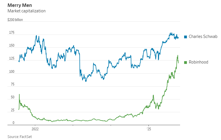 但如今,嘉信不再是一个以交易为核心的公司。在罗宾汉的压力下,嘉信理财和同行六年前取消了大部分交易佣金。现在,嘉信理财的利润来自庞大的经纪、银行和退休账户客户的资产,是一项相当平稳无趣的业务。