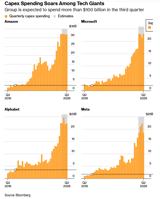 亚马逊和Meta等科技巨头将在本周公布季度业绩。投资者可能正在提前推高股价,预计各大公司将在AI和盈利方面达到高预期。根据彭博汇总的分析师预估,微软、Alphabet、亚马逊和Meta本财年在资本支出上的总投入将达到3600亿美元,其中大部分用于AI相关领域。预计明年这一数字将增加至近4200亿美元。