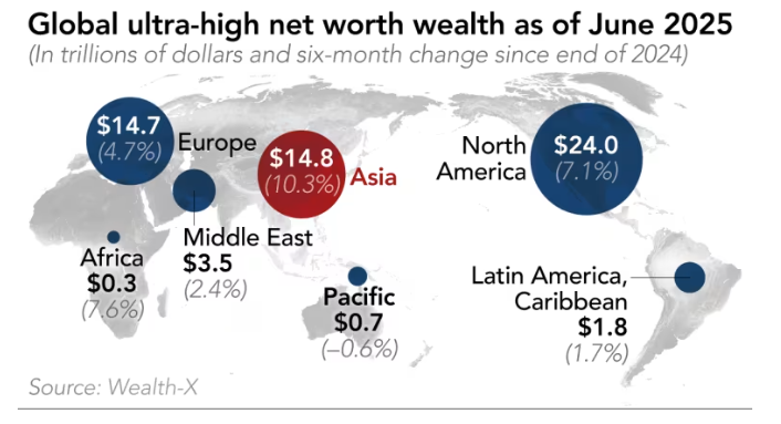 Wealth-X的数据显示,按人口和资产规模计算,亚洲拥有全球第二大超级富裕人群。截至6月,亚洲富豪总财富达14.8万亿美元,与欧洲的14.7万亿美元不相上下,但增长速度大约是欧洲同行的两倍。