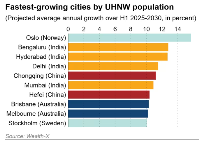 Wealth-X在9月发布的报告指出,到2030年,亚洲将成为超级富裕人群增长最迅速的地区。其中印度尤为突出,全球增长最快的十大城市中,班加罗尔、孟买、海得拉巴和德里占据四席。