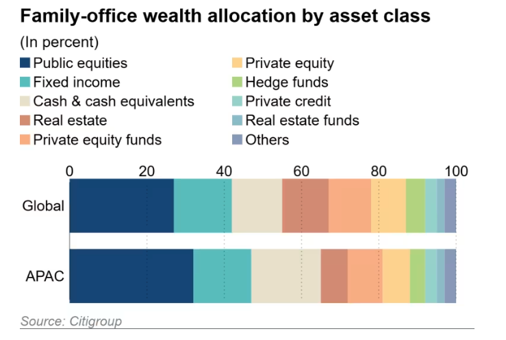 花旗财富9月发布的报告显示,亚洲家族办公室的资产配置中,股票占比最高,为32%,高于全球平均的27%;而现金配置也达18%,同样高于全球同行的13%。