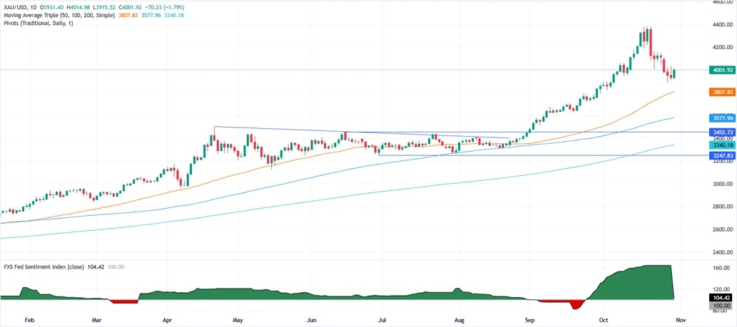Valencia称,若金价突破20日均线,则可能面临4100美元/盎司的阻力位,接下来是10月22日高点4161美元/盎司。
