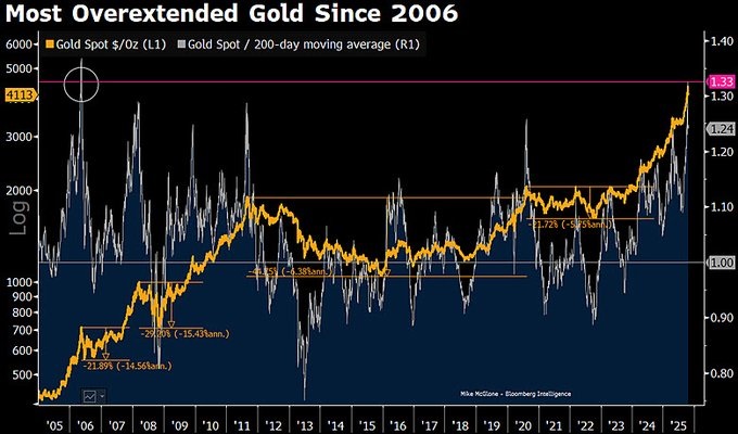 McGlone在10月26日的X帖子中强调,黄金当前的上涨行情已使其价格较200日移动平均线高出33%,这与过去贵金属在类似过度扩张后经历大幅下跌的情况如出一辙。