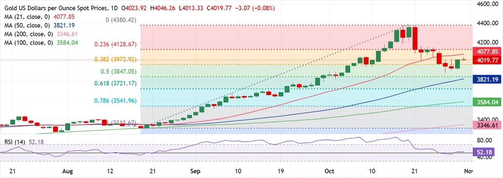 #黄金技术分析#24K99讯 周五(10月31日)亚市盘中,黄金在上一交易日惊人暴涨后出现回调,金价目前位于4002美元/盎司附近,日内下挫逾20美元。FXStreet高级分析师Dhwani Mehta撰文,对金价技术走势进行分析。